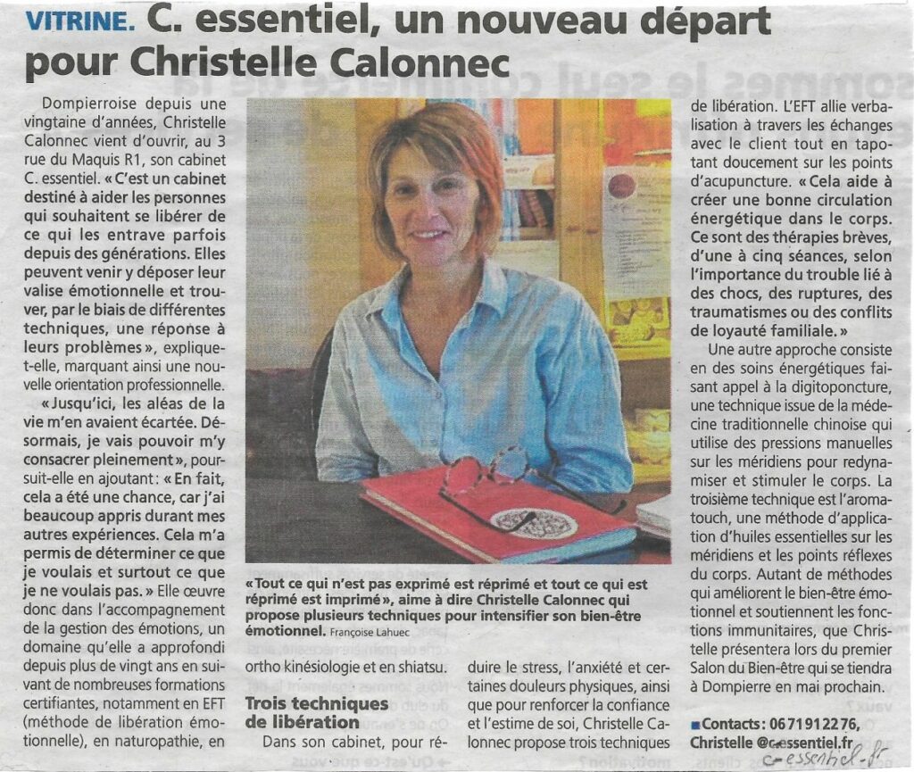 Dompierroise depuis une vingtaine d’années, Christelle CALONNEC vient d’ouvrir au 3 rue du maquis R1 son cabinet c-essentiel. « C’est un cabinet destiné à aider les personnes qui souhaitent se libérer de ce qui